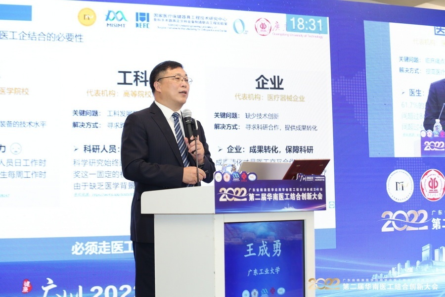 线上买球官网(中国)官方网站副校长、广东省精准医学应用学会医工结合分会主任委员、广东省微创手术器械设计与精密制造重点实验室主任王成勇教授,讲述了国家人民对于医工结合的迫切需求和医工结合的必要性,并列举了若干医工融合的案例。王成勇教授以政策给予医工融合的强大支持以及国内医疗器械市场的潜力为依据,阐述医工融合是未来发展的大趋势,是高校-医院-企业联合行动,保障人民生命健康的重要方向。王成勇教授还向大家介绍了MisIMT实验室医工融合的发展历程及科研成果。