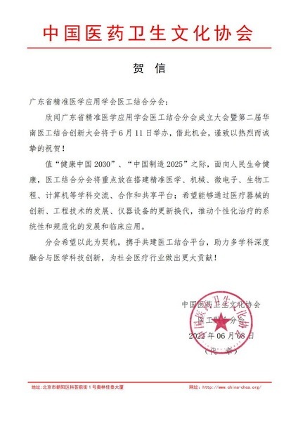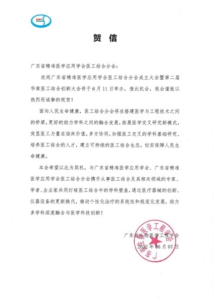 广东省精准医学应用学会医工结合分会的成立,引起行业高度关注和热情支持。中国医药卫生文化协会医工融合分会、广东省生物医学工程学会、东南大学泰州生物医药及医疗器械研究院、南京医工交叉创新中心纷纷发来贺信。