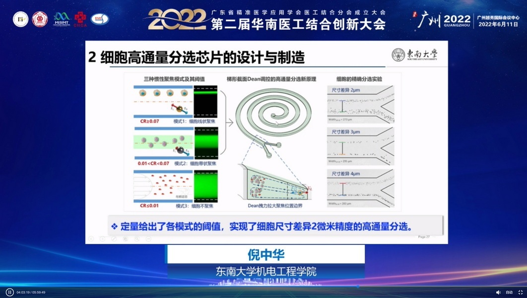东南大学机械工程学院院长倪中华介绍了精确进样微阀的设计与制造、高通量分选芯片的设计与制造、细胞电阻抗检测芯片的设计与制造。