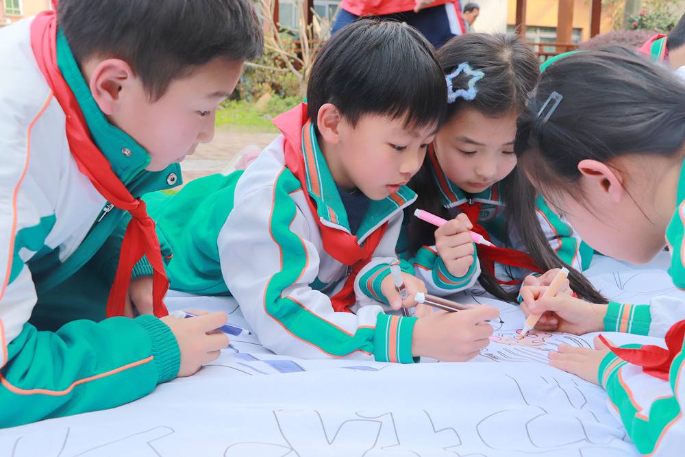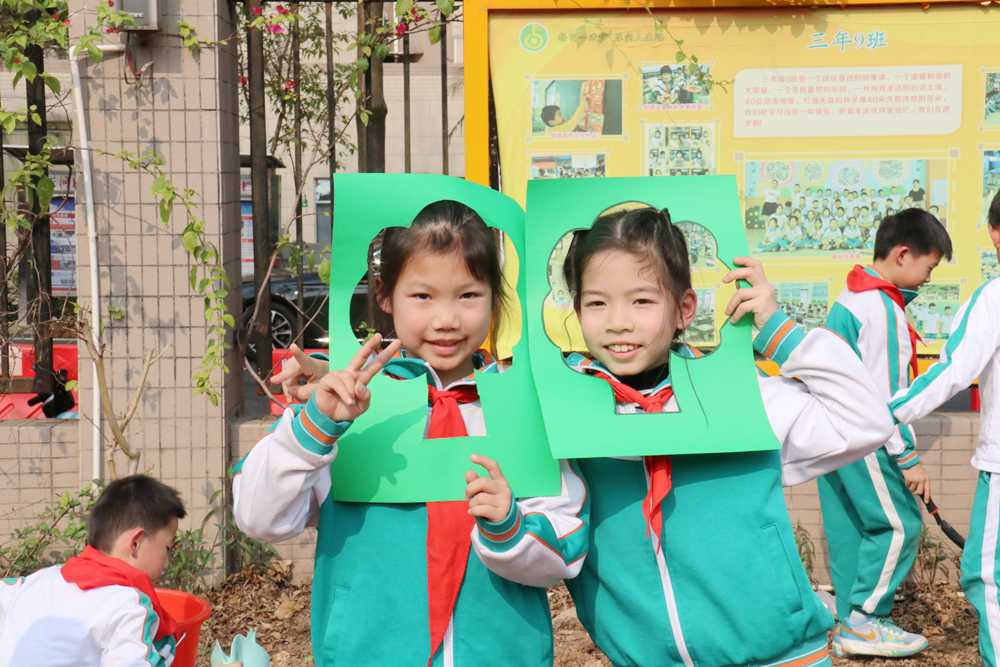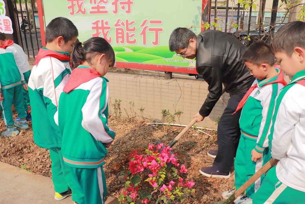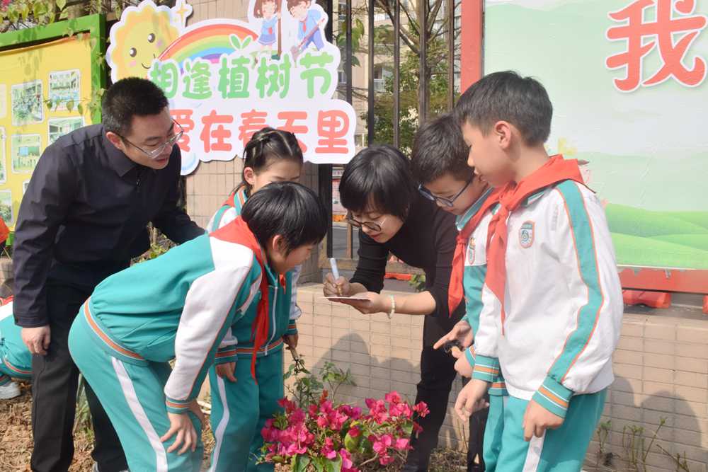 植树现场师生们热情高涨,挥锹铲土、扶苗填坑、提水浇灌,呈现出一派热火朝天的春植景象。大家配合默契,经过一番辛勤劳动,小花苗们在操场边昂然挺立。学生们在植物认养牌上写下承载希望的树名和心灵寄语,“红领巾林”“我和小树共成长”等一块块醒目的铭牌被竖立起来,在同学们亲自栽种和装饰下与“认养人”产生独有的情感联结,无不描绘出小学生们对“春”暖花开、“耕”种未来的渴望,传递着师生们对绿美校园的美好祝愿。