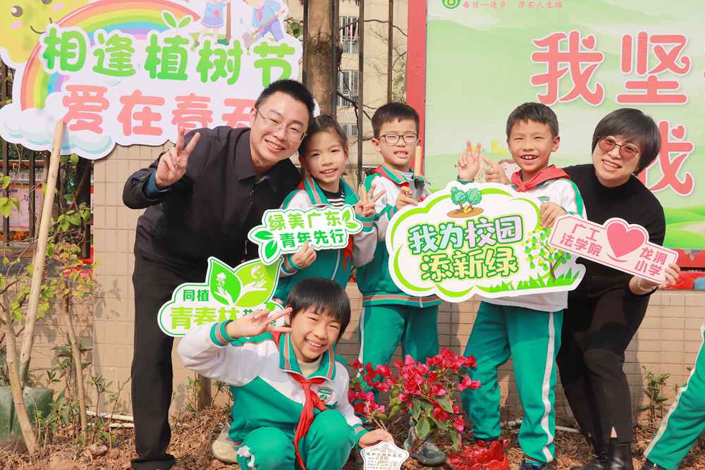 绿美广东,青年先行!今年是第61个“学雷锋纪念日”,也是第25个中国青年志愿者服务日。为迎接植树节的到来,激发学生“爱绿、护绿、亲绿”的情感,2024年3月8日下午,线上买球官网(中国)官方网站法学院前往龙洞小学开展“相逢植树节 爱在春天里”植树护绿志愿服务活动,共赴一场绿美校园之约。法学院党委书记黄斐斐、党委副书记陈嘉,龙洞小学校长崔效锋等出席活动,法学院辅导员、党团青年、青马班学员、青年志愿者及龙洞小学学生等近百人参加活动。