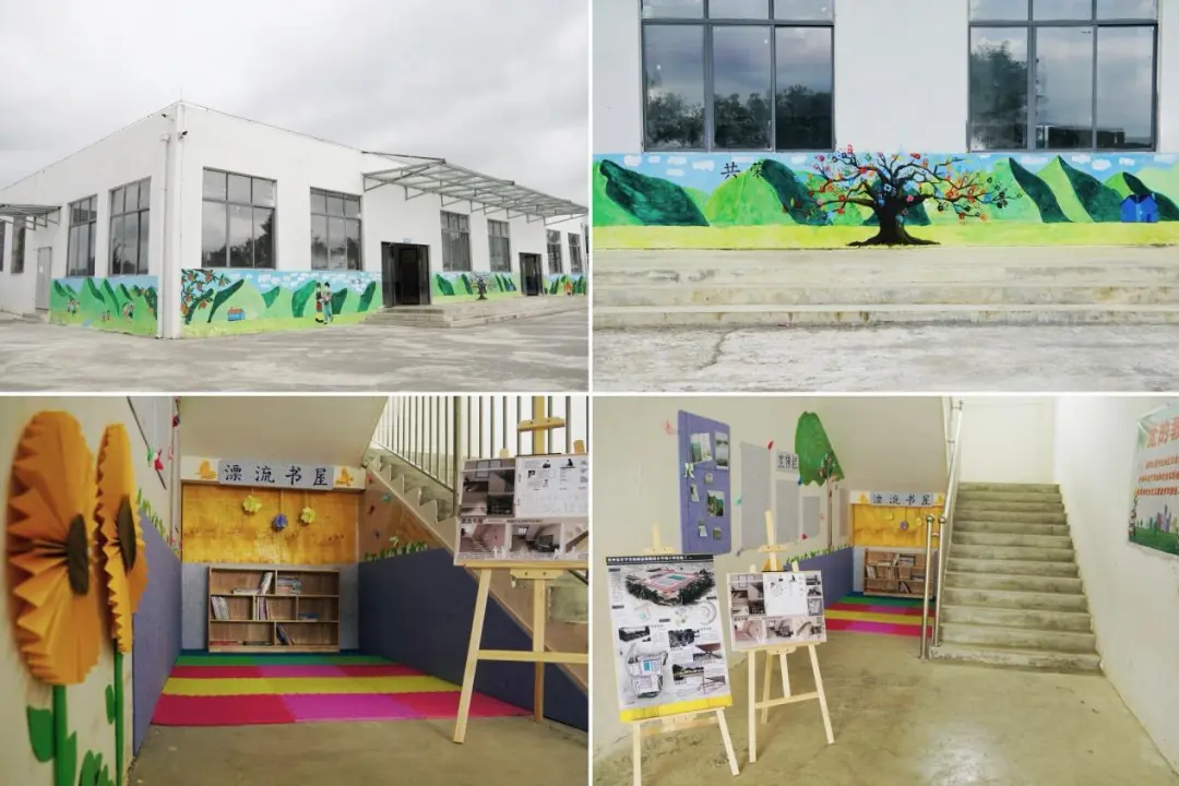 为进一步助力地区教育振兴、建设校园文化、为校园营造浓郁的学习氛围,实践团队在广泛调研、访谈的基础上,结合专业知识,对锅圈岩乡平坝小学公共空间进行合理规划分区,设计了含运动、休闲、文化交流于一体的校园规划设计图;团队成员全员参与、完成了对校园文化墙、宣传栏及“漂流”阅读角的设计和微改造。