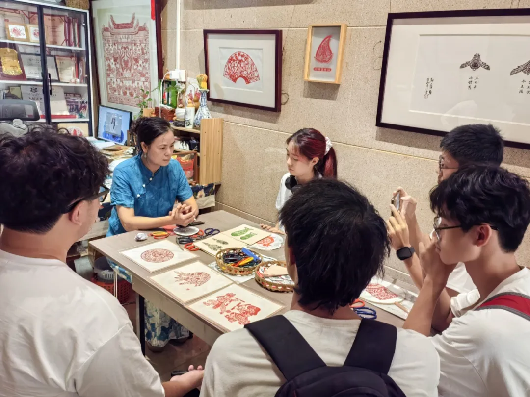 在国家级非遗项目(潮阳剪纸)省级代表性传承人郑少燕女士的介绍下,队员们对潮阳剪纸的文化内涵与风格特色有了进一步的了解。队员们在郑少燕女士的悉心指导下学习潮阳剪纸,掌握了剪纸的基本技巧,并充分发挥创造力,结合潮阳剪纸中丰富多彩、寓意吉祥的图案,设计文创产品。