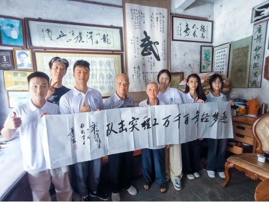 突击队成员在林润惠教授带领下拜访了见证学校办学历史的曾华生先生,曾老先生回忆起那段动荡不安的岁月,依然被师生们坚持办学的精神打动,师生与村民们携手并肩,将简陋的程氏大宗祠变成知识的殿堂。同时,他鼓励突击队同学们作为新时代的青年,不仅要铭记历史,更要继承和发扬前辈们那种以知识报国、勇于担当的精神。