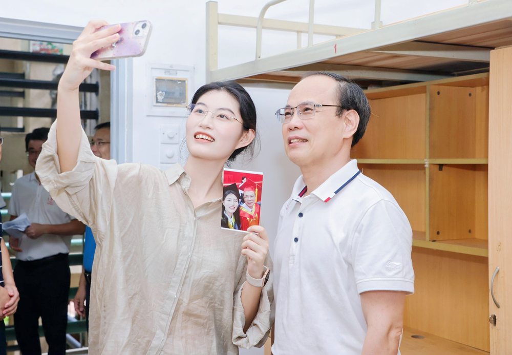 “校长,可以合个影吗?”在各学院迎新站点,不时有学生向校长“求合影”。邱学青欣然接受,与新生、工作人员合影交流。在环境科学与工程学院、机电工程学院、轻工化工学院等新生宿舍,邱学青与大家聊家常、谈发展,从德智体美劳五个方面介绍了广工人才培养特色与学生的获得感。他寄语新生:“大学是一个全新的舞台,你们要比以前更加努力,才能绽放夺目光彩。希望你们在广工学有所得、学有所成,努力成为德智体美劳全面发展的社会主义建设者和接班人。”