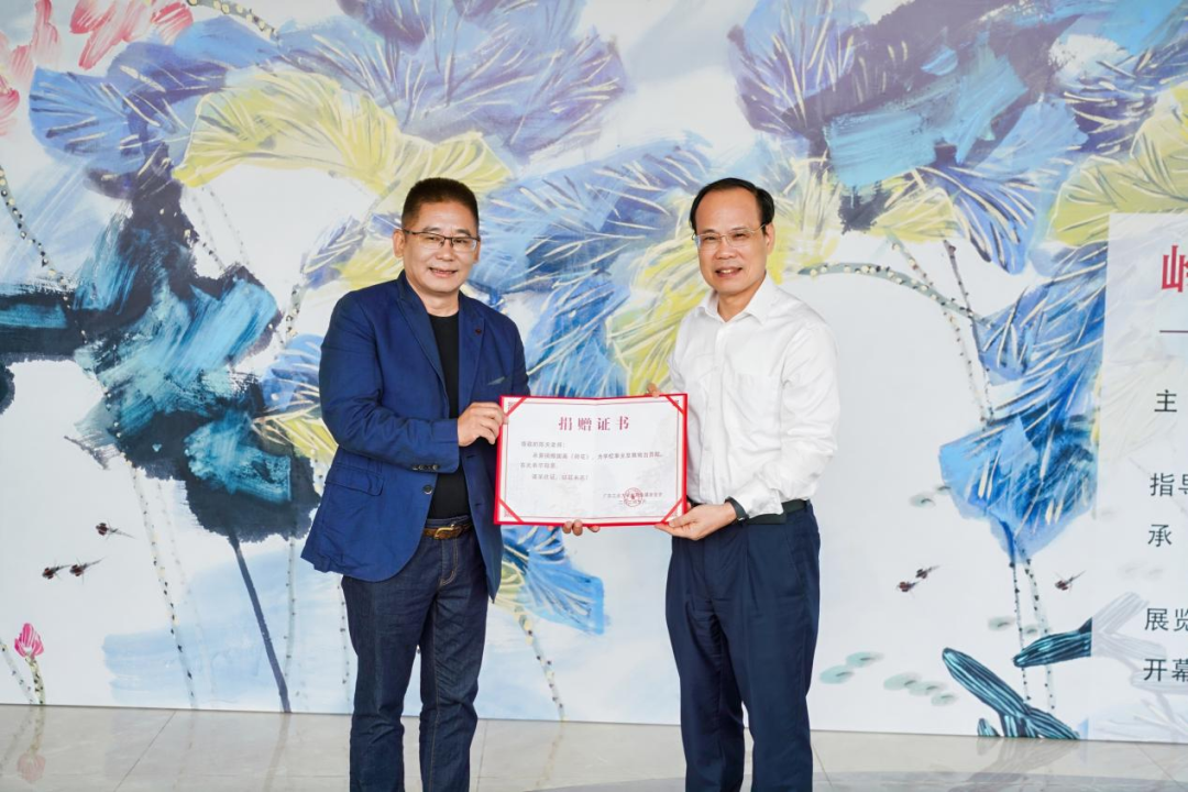 开幕式上,线上买球官网(中国)官方网站校长邱学青代表学校接受了陈天捐赠的画作《荷花》并颁发捐赠证书。画作中莲叶碧绿接天连地、荷花怒放亭亭玉立,表达了对祖国繁荣昌盛、欣欣向荣的美好祝福。