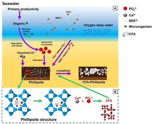 该研究同时指出,钙十字沸石诱导自生碳氟磷灰石形成很可能是深海环境中一种广泛存在的矿物界面反应,该场景中自生碳氟磷灰石对于海洋磷循环乃至对于深海稀土富集具有重要潜在作用,值得进一步研究。